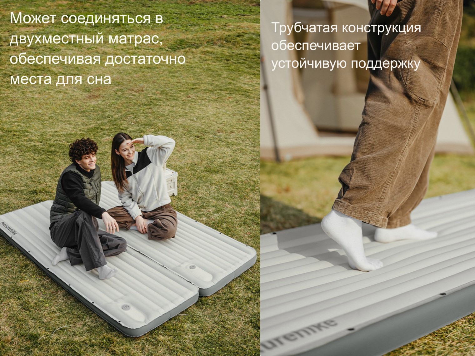 Матрас Naturehike CNK2450WS034 надувается до размеров 198 х 68 см, которых достаточно для одного человека. Вы можете объединить 2 таких матраса с помощью боковых застежек, чтобы увеличить место для сна.
