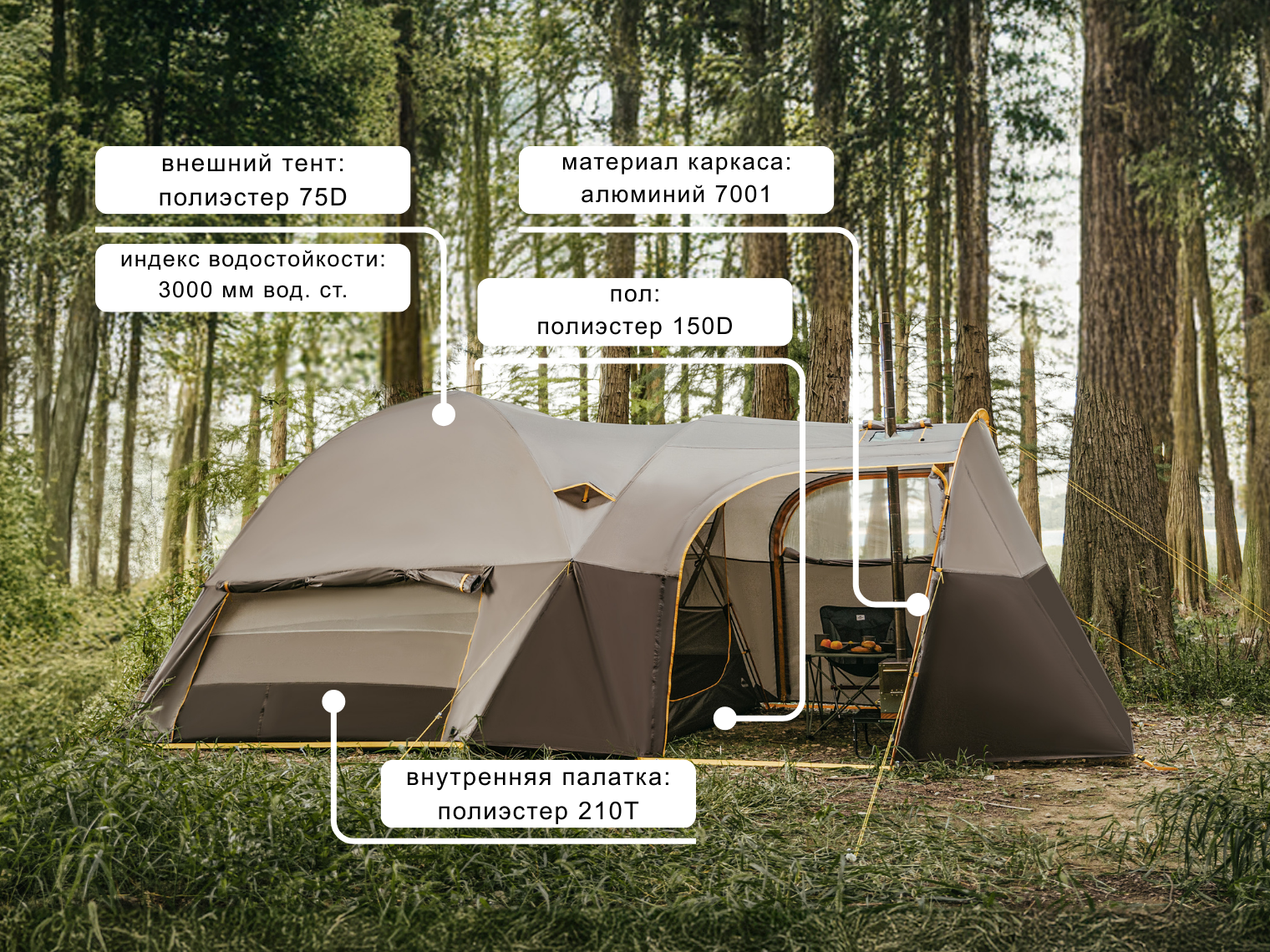 - Внешний тент и внутренняя палатка из полиэстера 75D 210T. Плотные синтетические нити устойчивы к истиранию и повреждениям во время погодных нагрузок. Водоотталкивающее покрытие внешнего тента (3000 мм вод. ст.) защищает материал от намокания во время дождя и повышенной влажности воздуха.