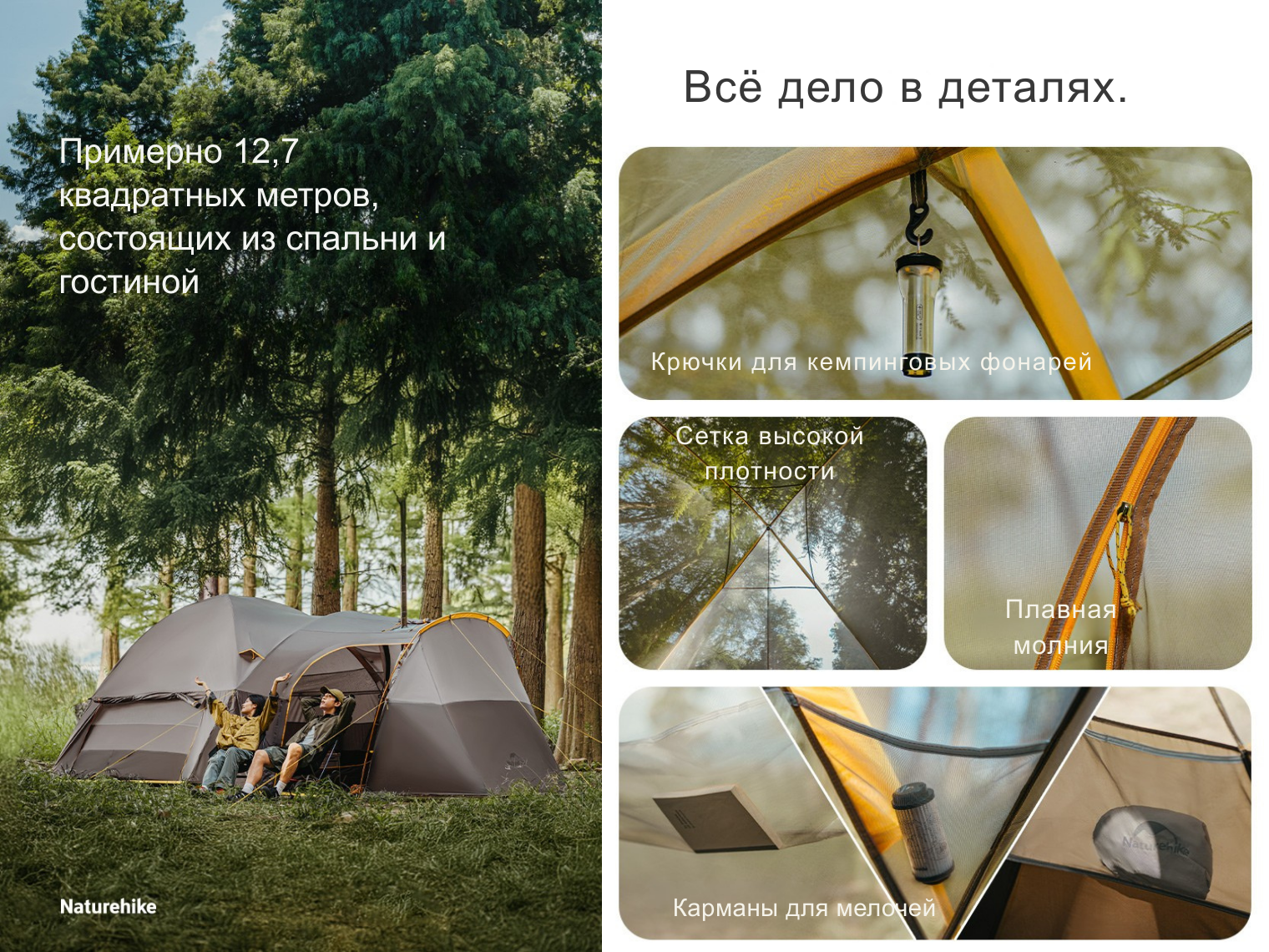 Для удобства предусмотрены практичные детали. Внутренние карманы для хранения мелких вещей, таких как фонари, повербанки и другие предметы, которые хочется держать под рукой. Под потолком есть крючок для подвешивания кемпингового фонаря.