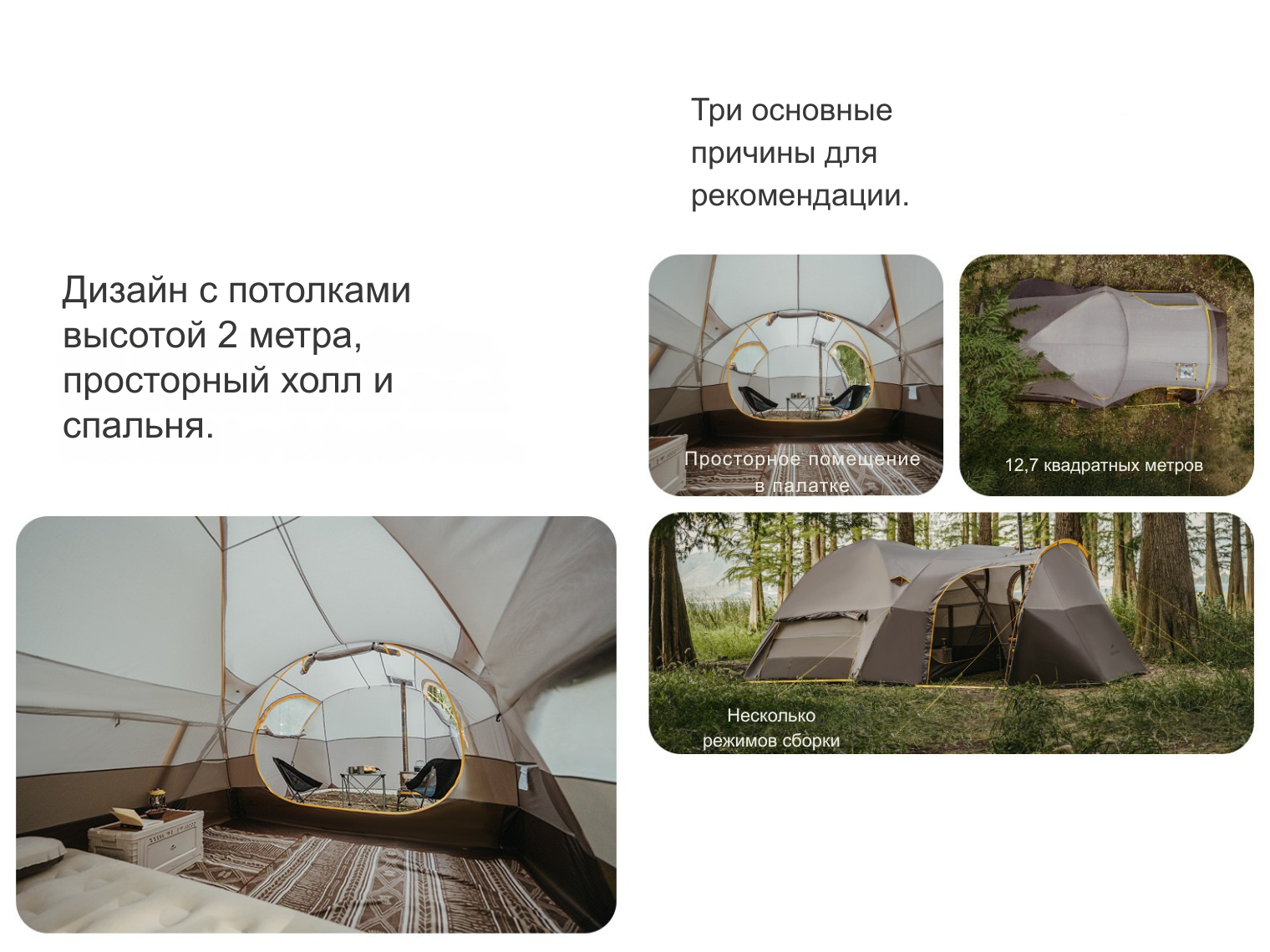 Потолок высотой 2 м позволяет перемещаться в полный рост. Пространство разделено на зоны для хранения снаряжения, сооружения мини гостиной и спальни, чтобы вы могли обустраивать место для отдыха с максимальным комфортом.