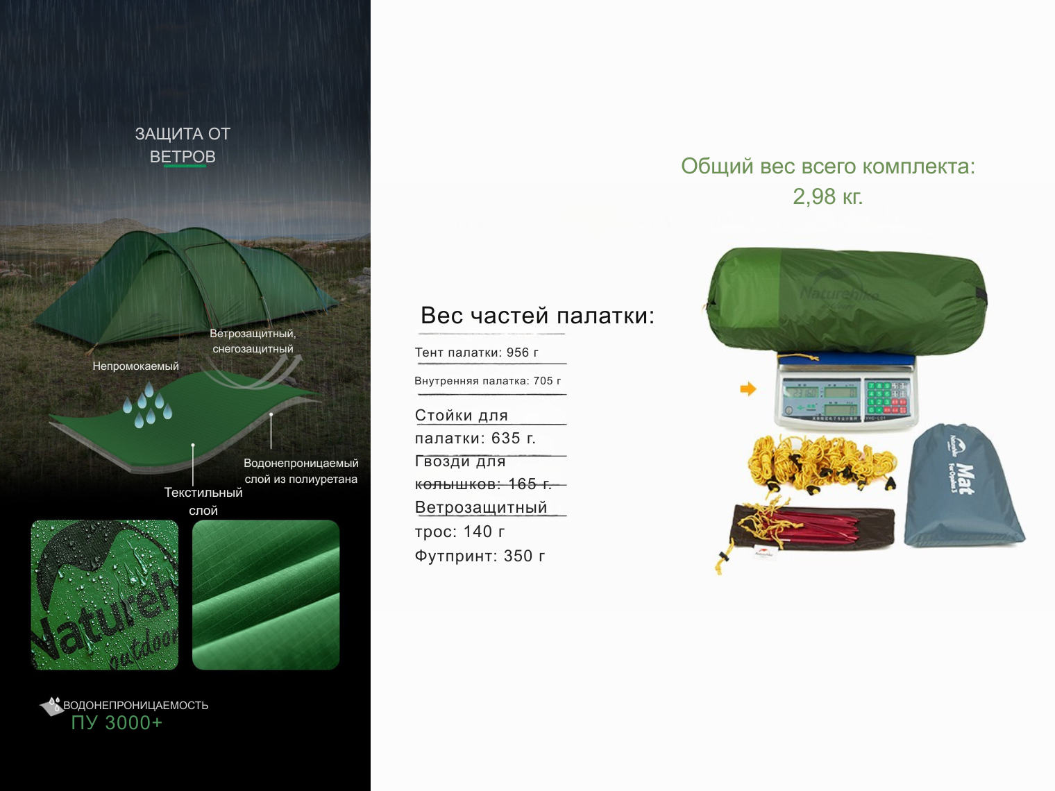 - Основной материал — нейлон 20D с PU-покрытием (водостойкость 4000 мм вод. ст.). Ткань легкая, но невероятно прочная благодаря сверхплотному переплетению нитей. Покрытие из полиуретана отталкивает влагу, защищая от интенсивных осадков и утренней росы.