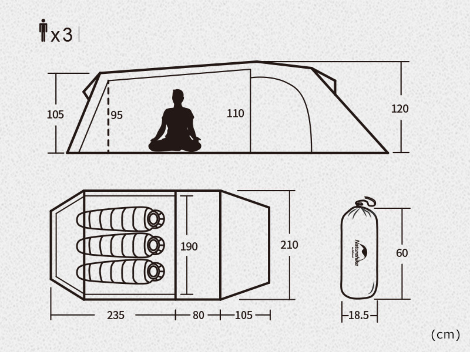 Палатка Naturehike Opalus NH17L001-L рушит стереотипы о том, что просторная конструкция обязательно должна быть тяжелой. При весе всего 2.9 кг, эта модель раскладывается до размеров 420 х 210 х 120 см: из них спальная зона 235 х 190 см для 3 человек и вместительный тамбур длиной почти 2 м.