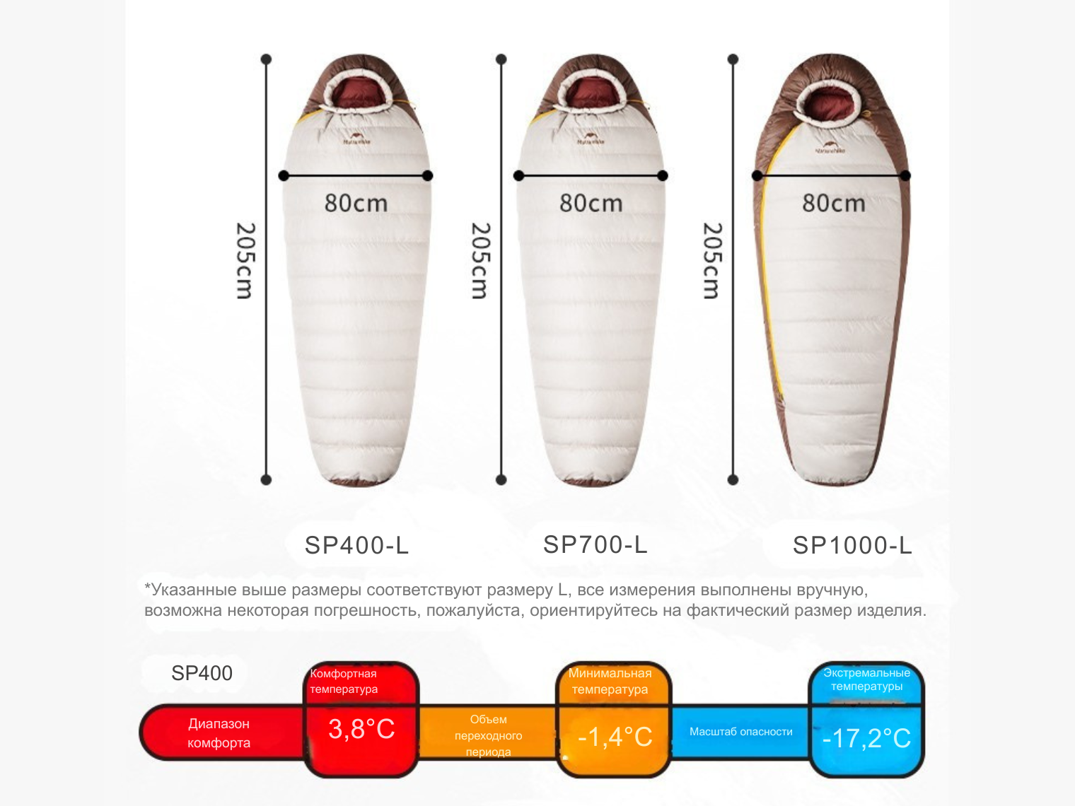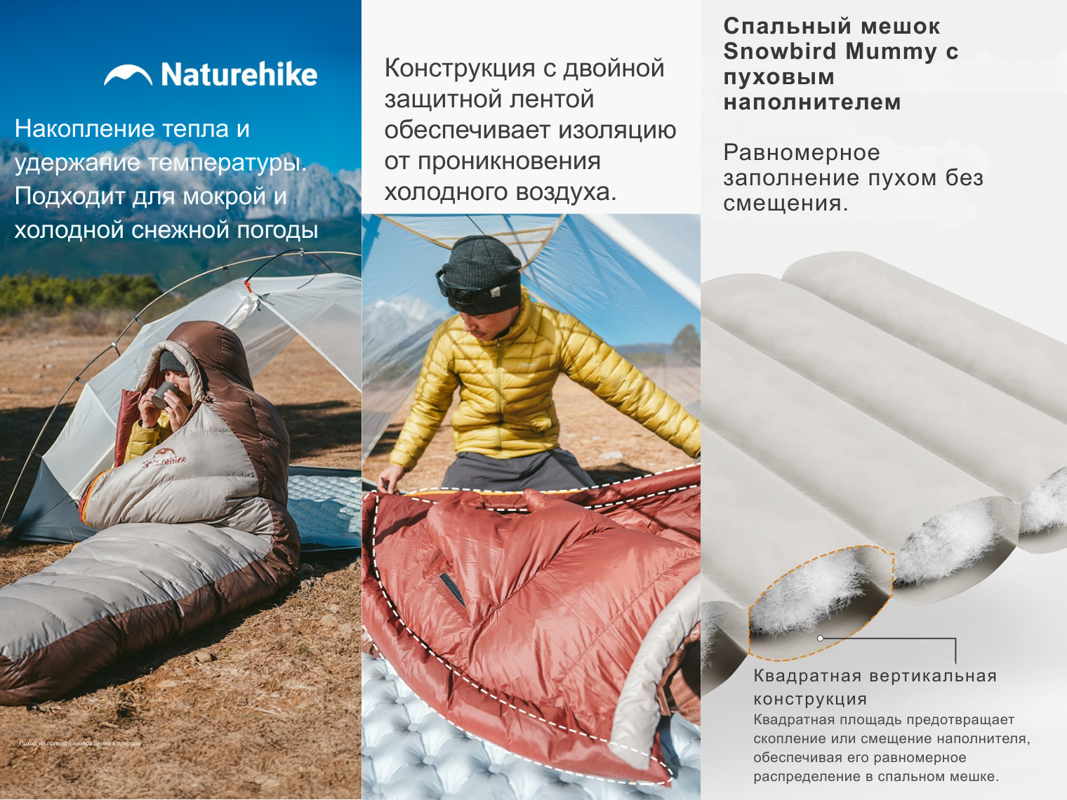 Описание спальника с натуральным пухом Naturehike Snowbird CNK2550WS014, p-р L, коричневого 400 г: