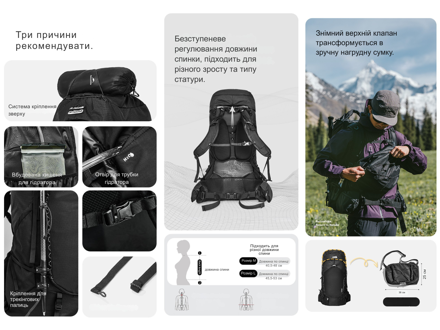 Опис туристичного рюкзака Naturehike CNK2450XB014, 70 л, чорного, M: