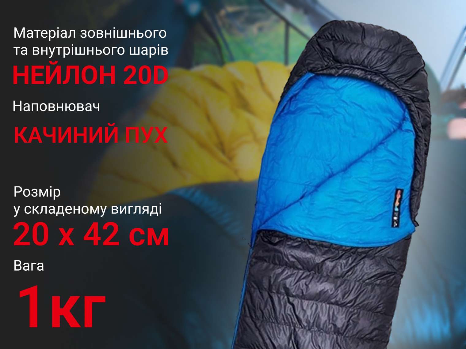 - Зовнішній шар з нейлону 20D. Міцна тканина з надщільним плетінням стійка до зношування та появи розривів. Поверхня не шарудить під час руху та відштовхує воду й бруд, зберігаючи спальник сухим і чистим.