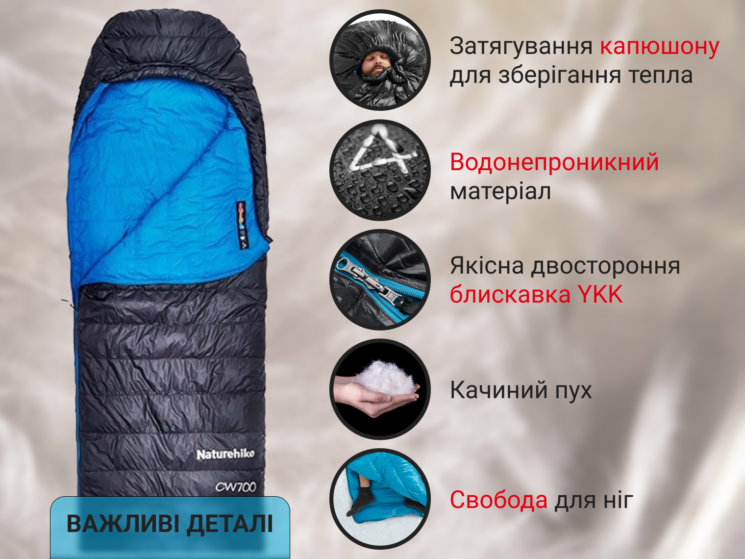 Опис спальника з натуральним пухом Naturehike CW700 CNK2450WS048, p-р M, жовто-сірого: