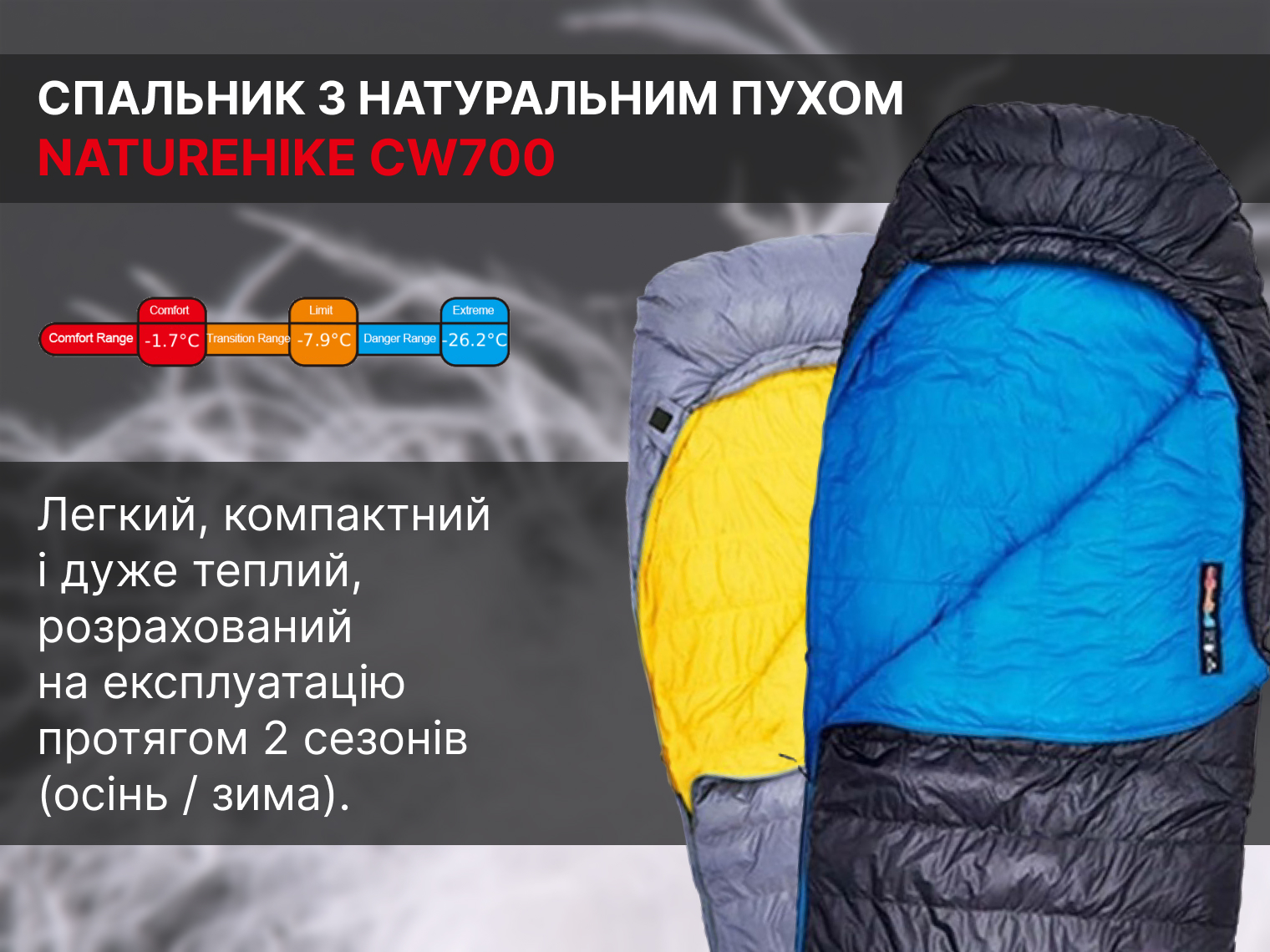 Спальник Naturehike CW700 гарантує здоровий сон на природі взимку та в холодне міжсезоння. Модель розрахована на температуру від -1.7°C до -7.9°C, оберігаючи від переохолодження, а водовідштовхувальні матеріали виключають намокання у вологу погоду або у разі випадіння конденсату в наметі.
