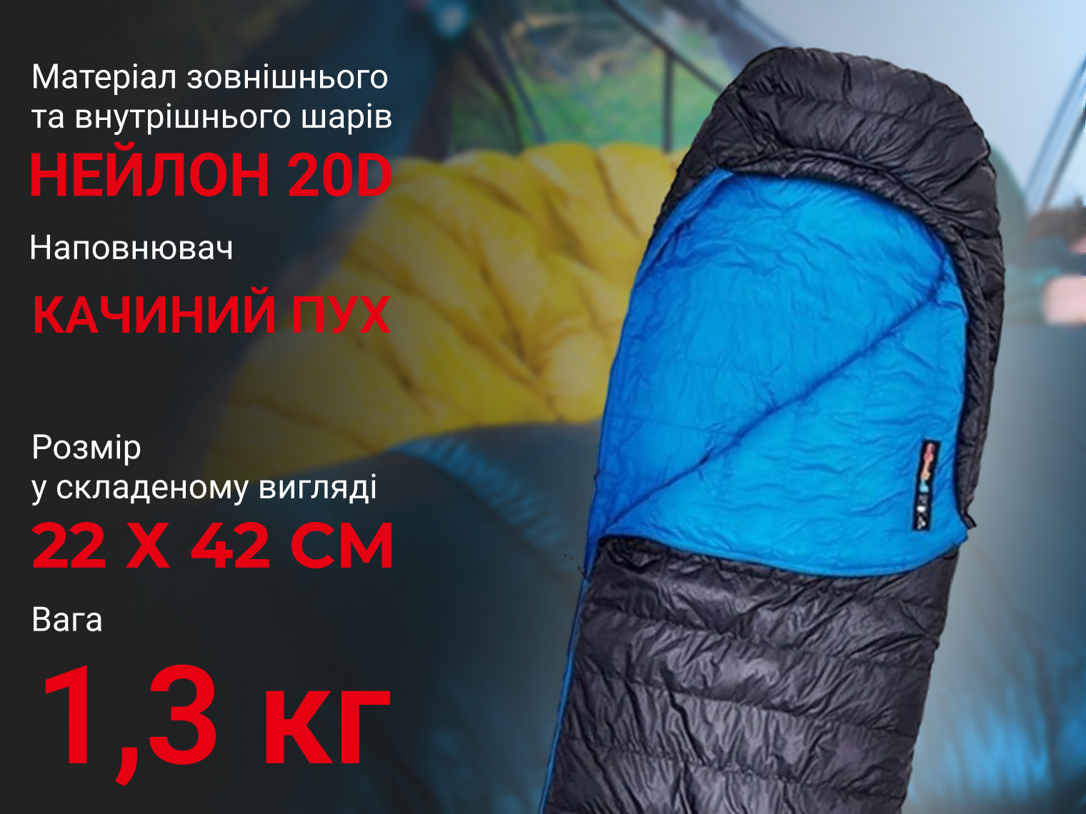 - Зовнішній шар з нейлону 20D. Міцна тканина з надщільним плетінням стійка до зношування та появи розривів. Поверхня не шарудить під час руху та відштовхує воду й бруд, зберігаючи спальник сухим і чистим.